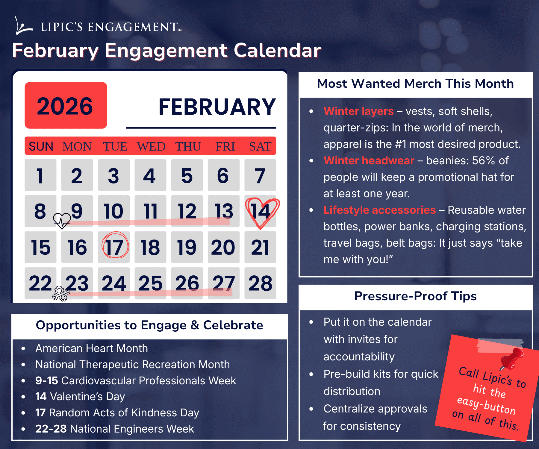 What’s your February Engagement Calendar look like? One thing we see every February? Teams have great engagement ideas — they just never make it onto the calendar. When recognition, merch drops, or appreciation moments aren’t scheduled, they get pushed aside by day-to-day priorities. We help teams fix that by building execution calendars that connect: relevant, seasonal moments branded merchandise recognition timing internal priorities It turns engagement from “we should do this” into “it’s already scheduled.” If it’s helpful, I’d be happy to share how this looks for teams like yours. Best, |