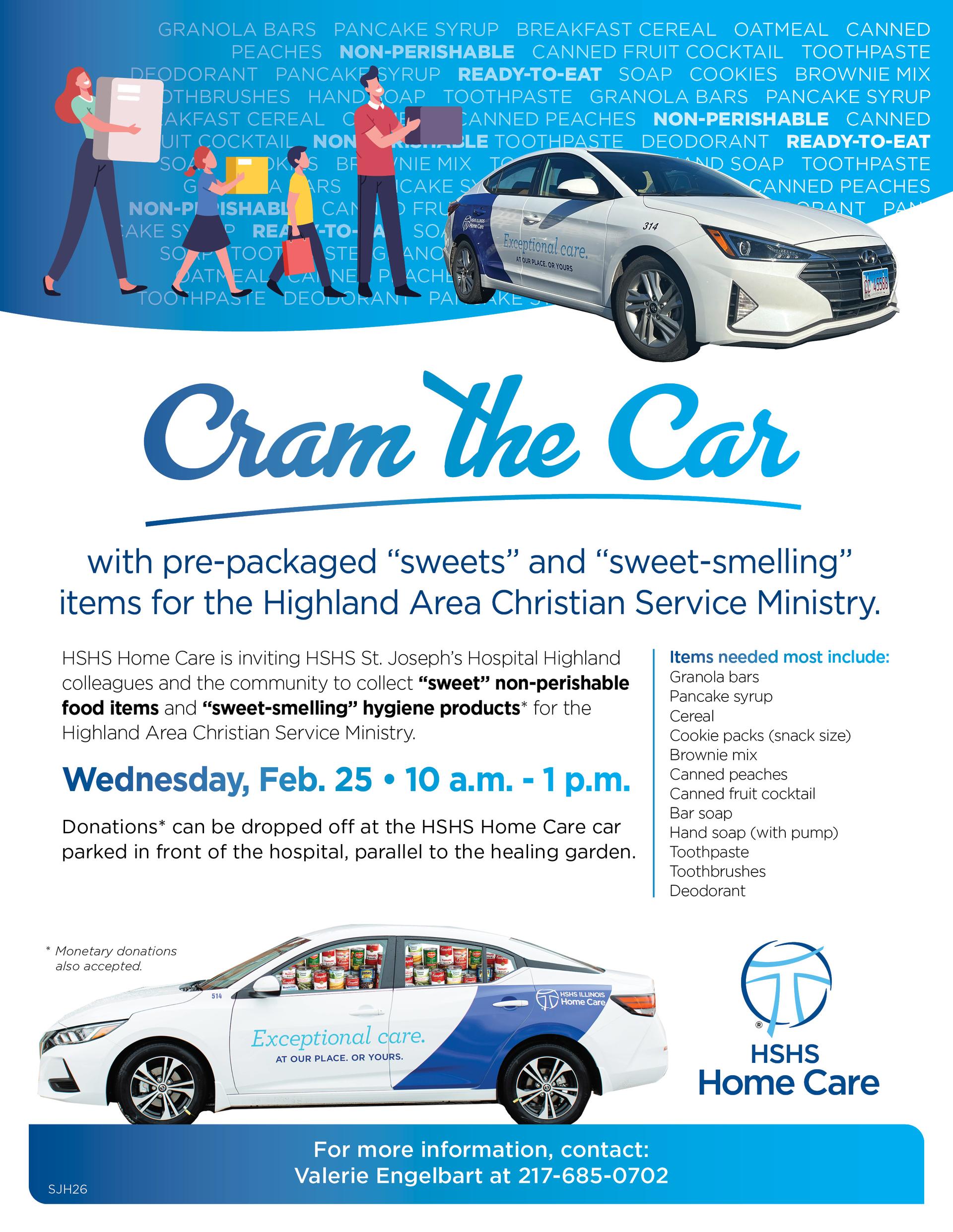 Help HSHS Home Care Collect Food Items for Local Food Pantries and Programs in Southern Illinois O’FALLON, Ill. — In recognition of February being National Canned Food Month, HSHS Home Care is holding its annual “Cram the Car” food drive this month for local organizations to help those struggling with food insecurity. |