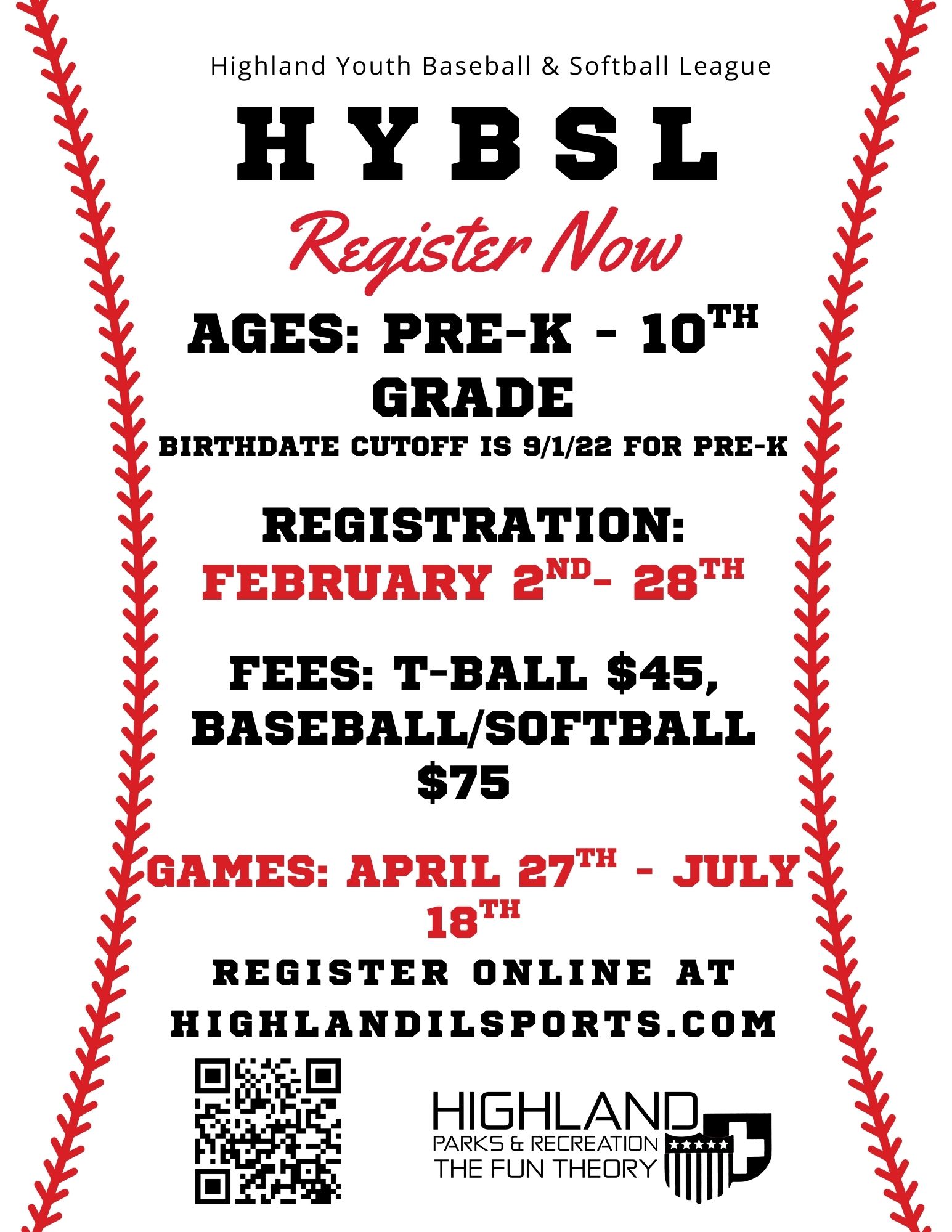 HYBSL Registration is OPEN! Highland Youth Baseball & Softball League is gearing up for another great season, and we’d love to have you join us! Ages: Pre-K – 10th Grade (Pre-K birthday cutoff is 9/1/22) Registration: February 2 – February 28 Fees: • T-Ball: $45 • Baseball/Softball: $75 Games Run: April 27 – July 18